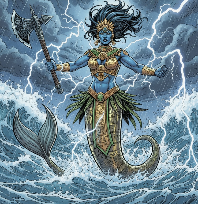 Ella estuvo armada con un hacha y contó con el poder de conjurar los rayos. Fue considerada la primera Acíhuatl, la primera mujer de agua o sirena nahua.