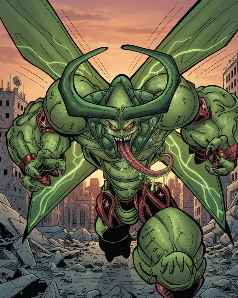 Luce como una polilla verde gigante con grandes colmillos, un par de alas de insecto, cuernos verdes y una lengua alargada y retorcida.