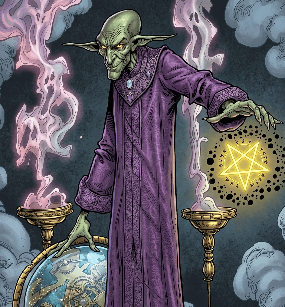 Es un hombre gris de orejas puntiagudas y túnica morada.