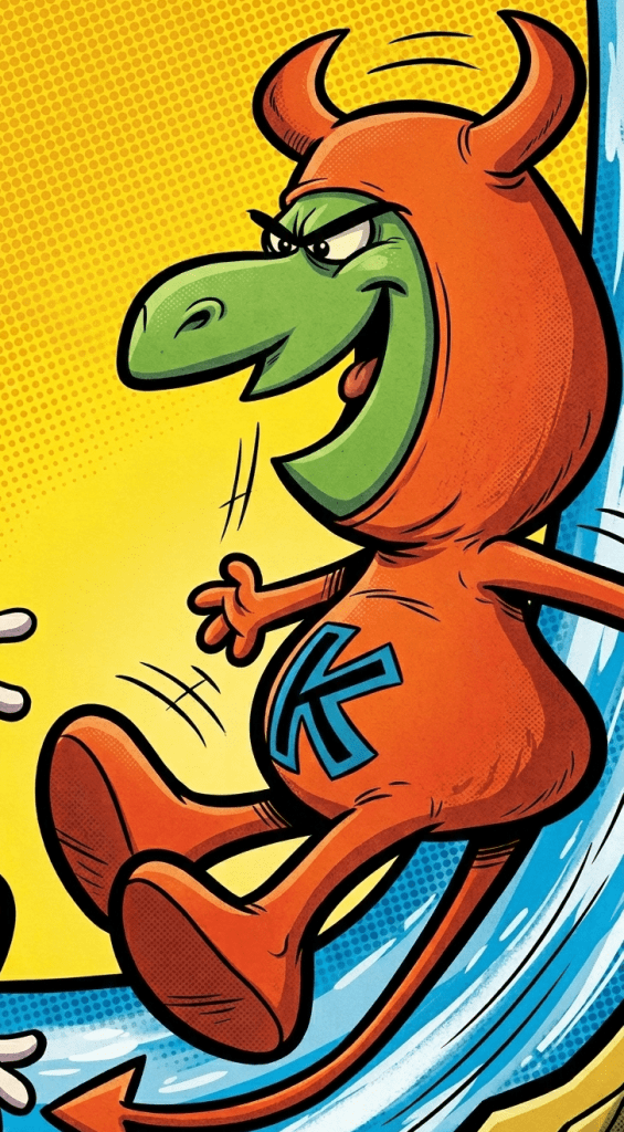 Es un demonio verde con traje rojo de diablito, con cuernos, cola y una K en el pecho.