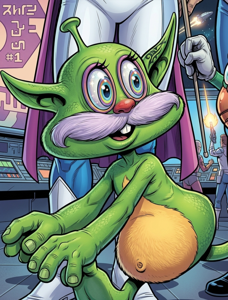 Es una criatura humanoide chaparra de color verde, con ojos azules, panzón, de orejas puntiagudas y una antena en la cabeza.