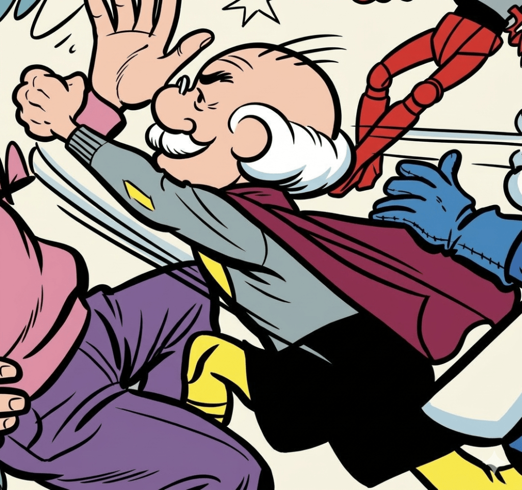 En el cómic, viste una capa amarilla, un traje rojo, con leotardo rojo, calzoncillos negros y botas amarillas. Es calvo, tiene canas y un bigote. No es muy alto.